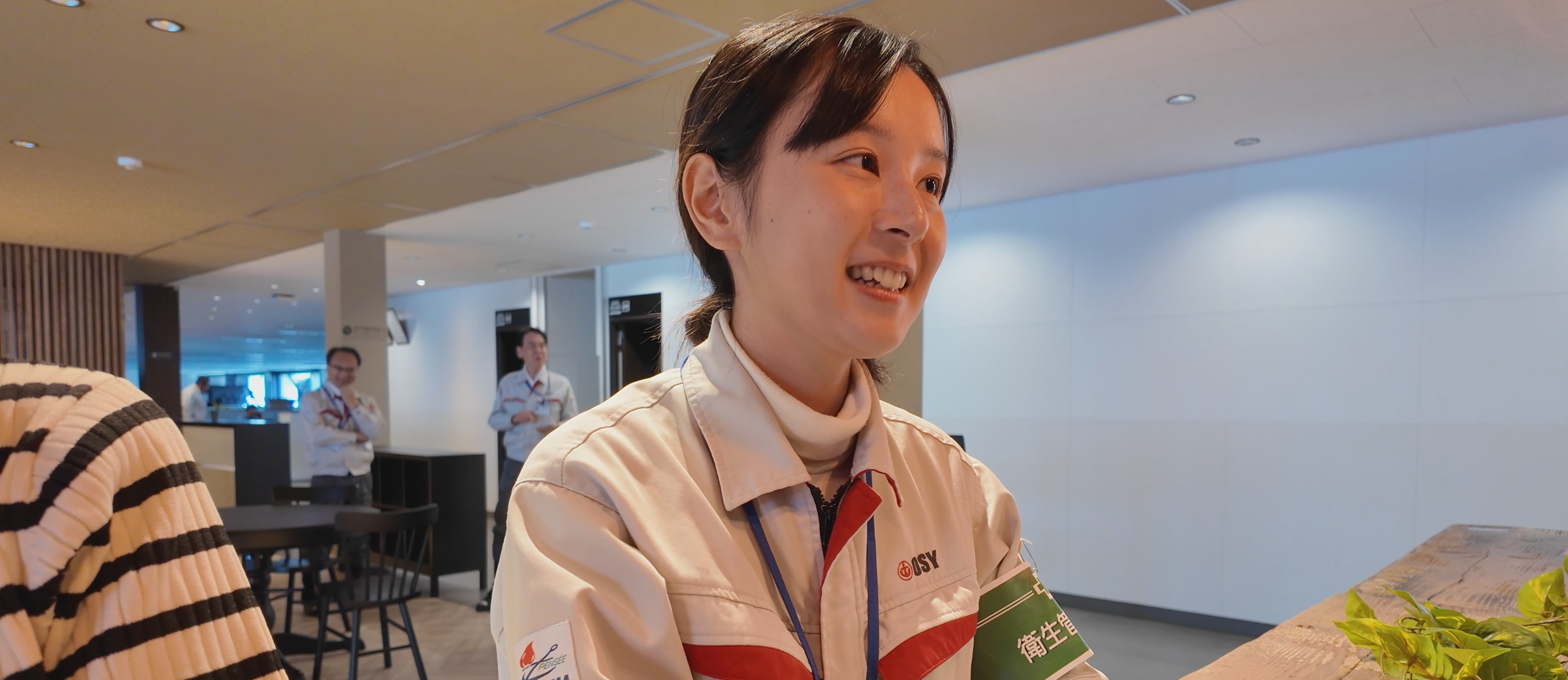 社内行事や施設・設備のメンテナンス、小学生向けの工場案内の引率など、業務の幅がとても広いので多様な経験を積むことができることです。社内業務以外に、社外に出ることも結構多いので楽しいですね。「ゴライアスクレーン」という大きなクレーンに乗れる貴重な経験もできたりします。