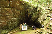 外海・黒崎教会の南側の丘にサン・ジワン枯松神社(かれまつじんじゃ)があります。日本でも珍しいキリシタンを祀った神社であるこの地は、禁教中に潜伏していたという宣教師サン・ジワンゆかりの地で、外海の潜伏キリシタン達の聖地であったという伝説が残されています。祠の下方には、祈りの岩と呼ばれる岩が残り、潜伏キリシタン達は、夜中にここへ来て「祈りの言葉」であるオラショを唱えていたと伝わります。また、「県民の森」から約2kmの山中には、日本人宣教師・トマス金鍔次兵衛(きんつば じひょうえ)が宣教の際に潜伏していたとされる次兵衛岩洞窟、牧野地区「岳の山」の地には、バスチャンと呼ばれた日本人伝道士が身を潜めていた場所とされるバスチャン屋敷跡があります。いずれもキリシタン関係伝承地として、全国はもとより海外からの巡礼者は後を絶ちません。トマス金鍔次兵衛神父は、方々に潜伏しながら、キリシタン達を励まし、ゆるしの秘跡を与え、ミサを捧げるという日々。弾圧で弱くなった多くの背教者を改心させ、新しいキリシタンには洗礼を授けました。禁教下に次兵衛神父によって洗礼を授けられた信者は実に500人を下らなかったといいます。 |