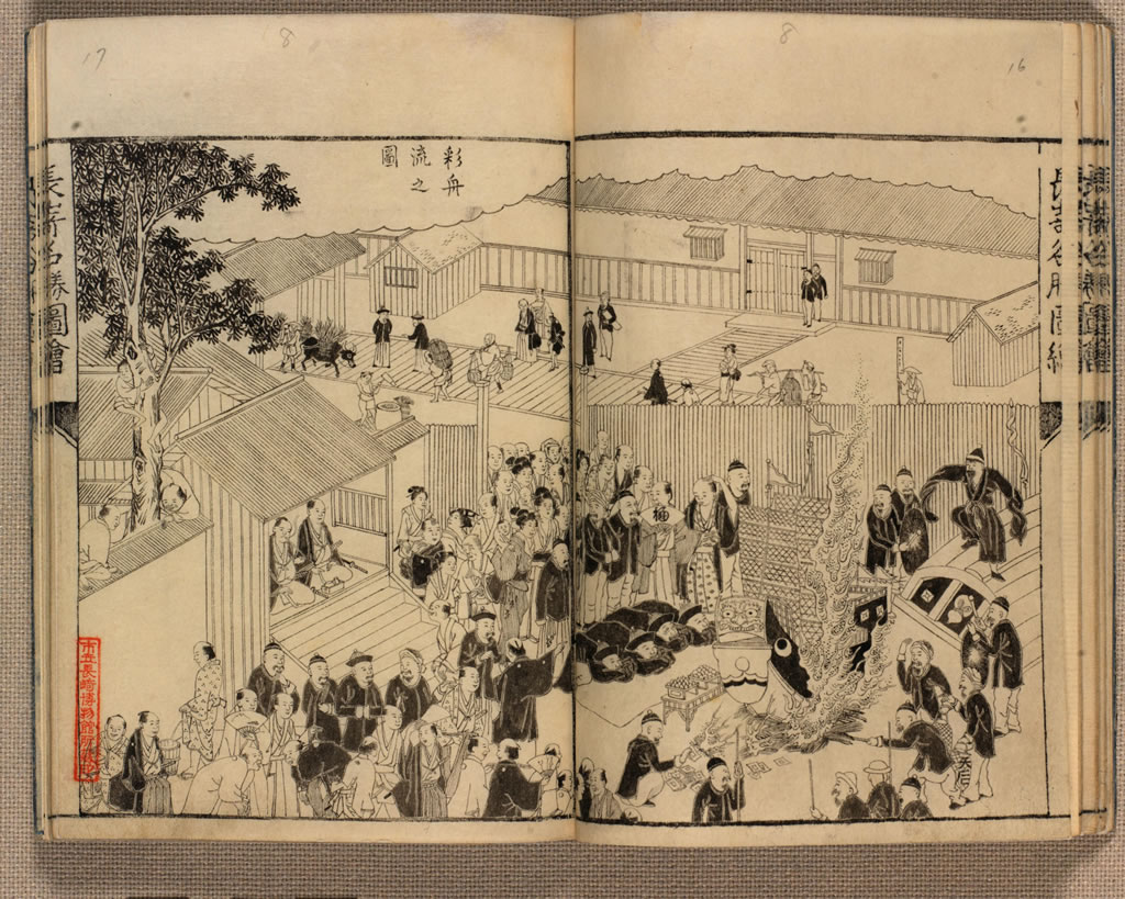 長崎奉行ら長崎の諸役人も招かれて開催された2月の行事が「唐人踊り」です。祭礼日は2日ですが、催しは前後数日間おこなわれました。支配勘定役として長崎に着任した蜀山人(しょくさんじん)こと太田直次郎もその著作『瓊浦雑綴(けいほざってい)』で紹介しています。土神堂を飾りつけ、側には大きな舞台を造ります。この舞台に踊りの得意な唐人たちが集い、様々な衣装を身に着けて、笛・銅鑼・喇叭(らっぱ)などの演奏に合わせて歌って踊ります。踊りの種類には出身地によって南京踊、?州(しょうしゅう)踊など、いくつもの種類があったそうです。水滸伝や三国志などを題材にした芝居も演じられました。