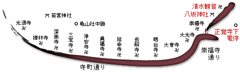 通りの正面に建つ赤い楼門が印象的な崇福寺から電車通りへ下る途中の小道を左へ入ると「ぎおんさん」の愛称で親しまれる八坂神社の奥に、こちらは「きよみずさん」の愛称で親しまれる清水寺がある。 |