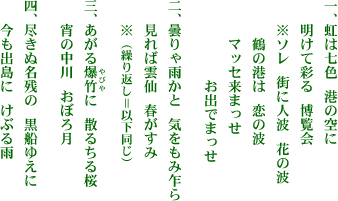 ユニークなタイトルの歌ですが、花月、丸山、ハタ揚げ、黒船などの長崎情緒と、博覧会第二会場の雲仙も歌っています。