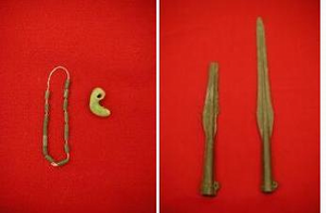 景華園遺跡は、島原市中野町に所在する弥生時代の墳墓群である。古くは元禄12年(1699)に遺物の発見が報じられ、昭和2年(1927)工事中に甕棺(かめかん)が発見され、棺内から当該資料の勾玉(まがだま)と管玉(くだだま)及び布片が出土している。また、それより1~2年前に同所より中細形銅矛(なかほそがたどうほこ)2点が発見されている。