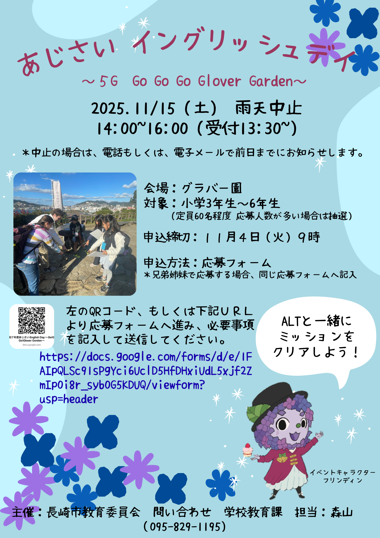 (1)長崎市内の小学生に、ALTなどの外国人と英語を用いてコミュニケーションを図る楽しさを体感させたり、日頃の外国語活動や外国語科での学習の成果を試したりする機会を提供することで、英語力の向上と国際感覚の醸成を図る。