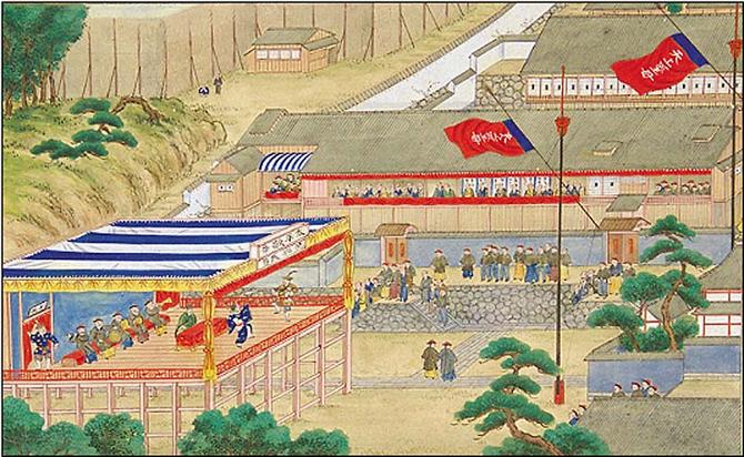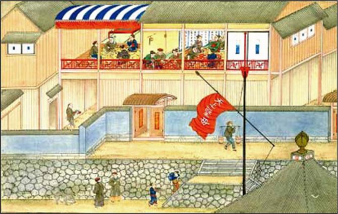 唐人屋敷に出入りを許された女性は、“唐人行”と呼ばれた遊女のみでした。右下の屋根は、土神堂のもので、中央の建物は、図3・観劇図の正面の建物を拡大したものです。石垣の構造や敷石の様子がわかります。