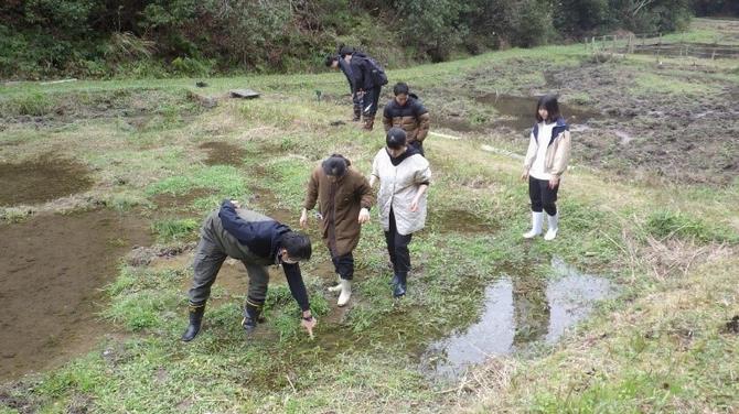 長崎市相川町にある当休耕田は、長崎市レッドデータブックに掲載されているニホンアカガエル、カスミサンショウウオ、ヘイケボタルなどの市内最大の生息地でしたが、平成8年頃に耕作がやめられてからは急速に乾地化が進み、それら湿地性の希少生物が絶滅の危機に瀕することとなりました。そのため、平成16年度から、地元自治会の協力を得て自然再生事業に着手し、現在では、ヘイケボタルの飛翔をはじめ、冬場の12月から春先の3月にかけて、ニホンアカガエル、カスミサンショウウオの成体と多くの卵塊が毎年、確認できる状態となっています。当休耕田は、人と自然とが触れ合える、市内でも貴重な生物生息環境(ビオトープ)となっています。