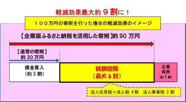 損金算入による軽減効果(寄附額の約3割)と合わせて、最大で寄附額の約9割が軽減されるため、実質的な企業様の負担は約1割となります。