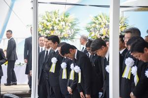 遺族代表 山崎 和幸さん、被爆者代表 吉村 ラン子さん、長崎市長、長崎市議会議長に続いて、内閣総理大臣、衆議院議長、参議院議長、外務大臣政務官、厚生労働大臣、自由民主党代表、立憲民主党代表、国民民主党代表、公明党代表、日本共産党代表、日本維新の会代表、社会民主党代表、長崎県知事、長崎県議会議長、広島市民代表、原爆死没者全国遺族代表、、国際連合事務総長名代、赤十字国際委員会駐日代表代理、各国駐日代表、日本非核宣言自治体協議会代表がそれぞれ献花を行いました。続いて、青少年代表等が献花を行いました。