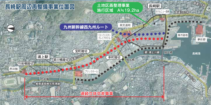 長崎市内を南北に走るJR長崎本線は、線路が地表面を走行していることから、鉄道による東西市街地の分断と交通渋滞が発生し、市民生活のみならず、都市圏全体の発展に大きな影響を及ぼしています。